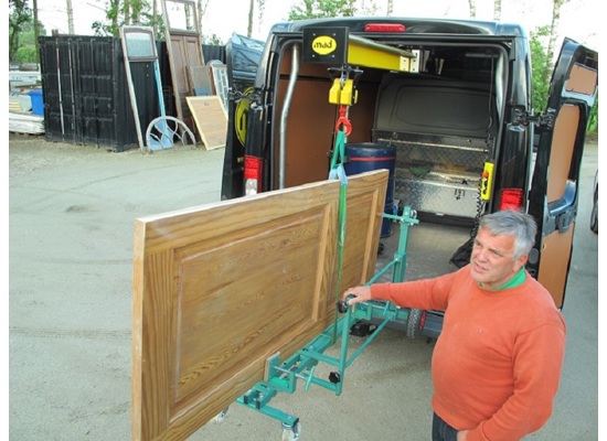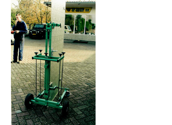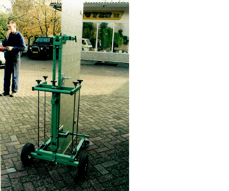 Met deze deurenplaatser kunt u deuren transporteren, horizontaal leggen voor afmonteren van het beslag en daarna afhangen in het kozijn. Met 4 draaischroeven en een waterpas kunt u de deur in het kozijn links/rechts, voor/achter bewegen.