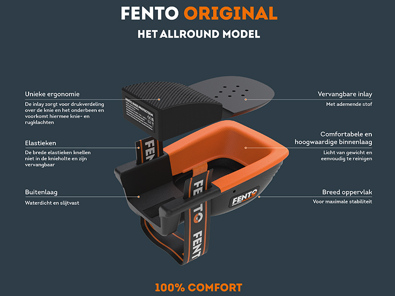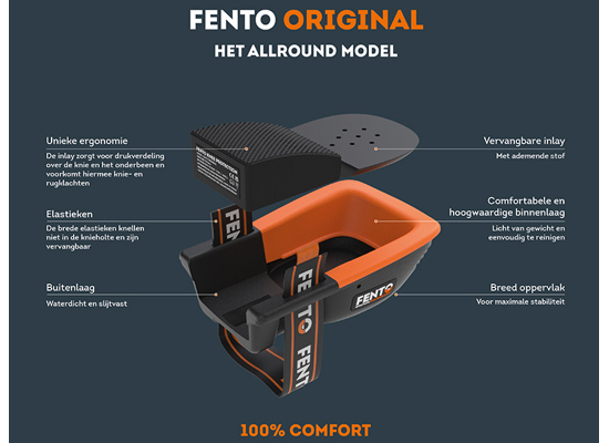 De FENTO ORIGINAL is ons meest allround type 1 kniebeschermer, mede-ontwikkeld door een fysiotherapeut. De ORIGINAL heeft een Ergonomic Wedge bij het scheenbeen, die ervoor zorgt dat de piekdruk op de knie verminderd wordt, door de druk te verdelen over het onderbeen: dit helpt knie- en rugklachten te voorkomen. Het heeft een verbeterde pasvorm die na verloop van tijd naar de vorm van je eigen knie gaat staan voor nog meer comfort, flexibiliteit en ergonomie. De FENTO ORIGINAL is enorm slijtvast en heeft een breed en plat oppervlak voor extra stabiliteit. Zowel de Inlays als de elastieken zijn vervangbare onderdelen. De buitenschaal van het product is volledig waterafstotend. Deze kniebeschermer is lichtgewicht met slechts 300 gram. De brede elastieken banden zorgen ervoor dat het niet in de knieholte knelt. De FENTO ORIGINAL is een EN14404:2010 Level 1, Type 1 gecertificeerd product.